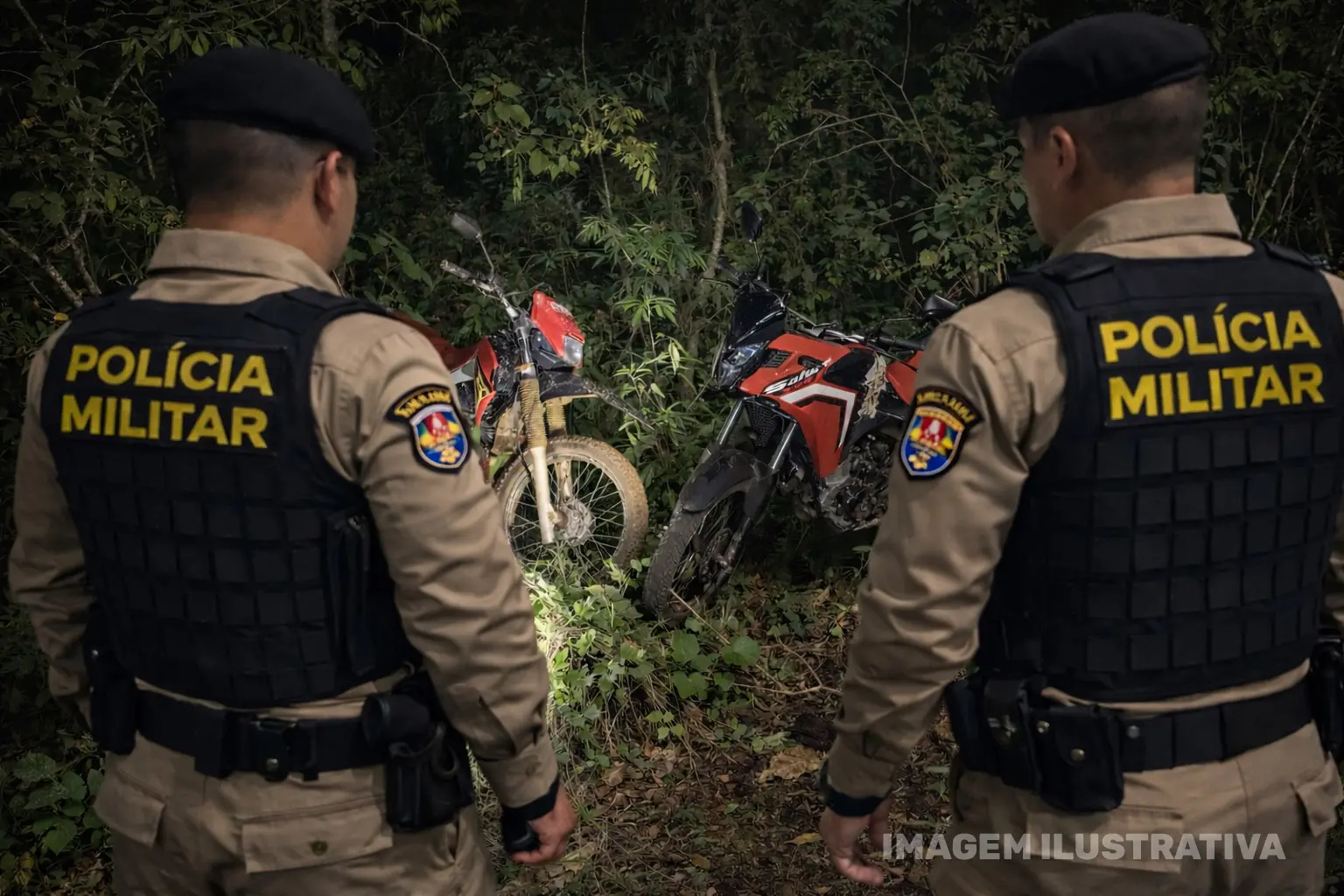 Com base nas informações repassadas, as equipes realizaram buscas e localizaram duas motocicletas com alerta de furto, ambas abandonadas em área de mata. Os veículos foram recuperados e encaminhados à delegacia responsável.