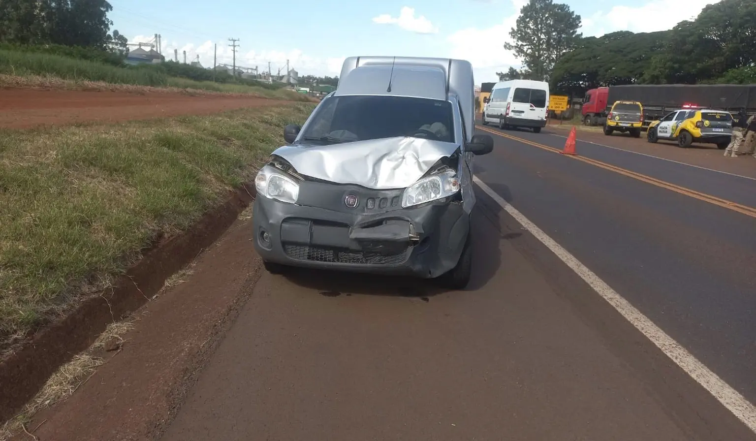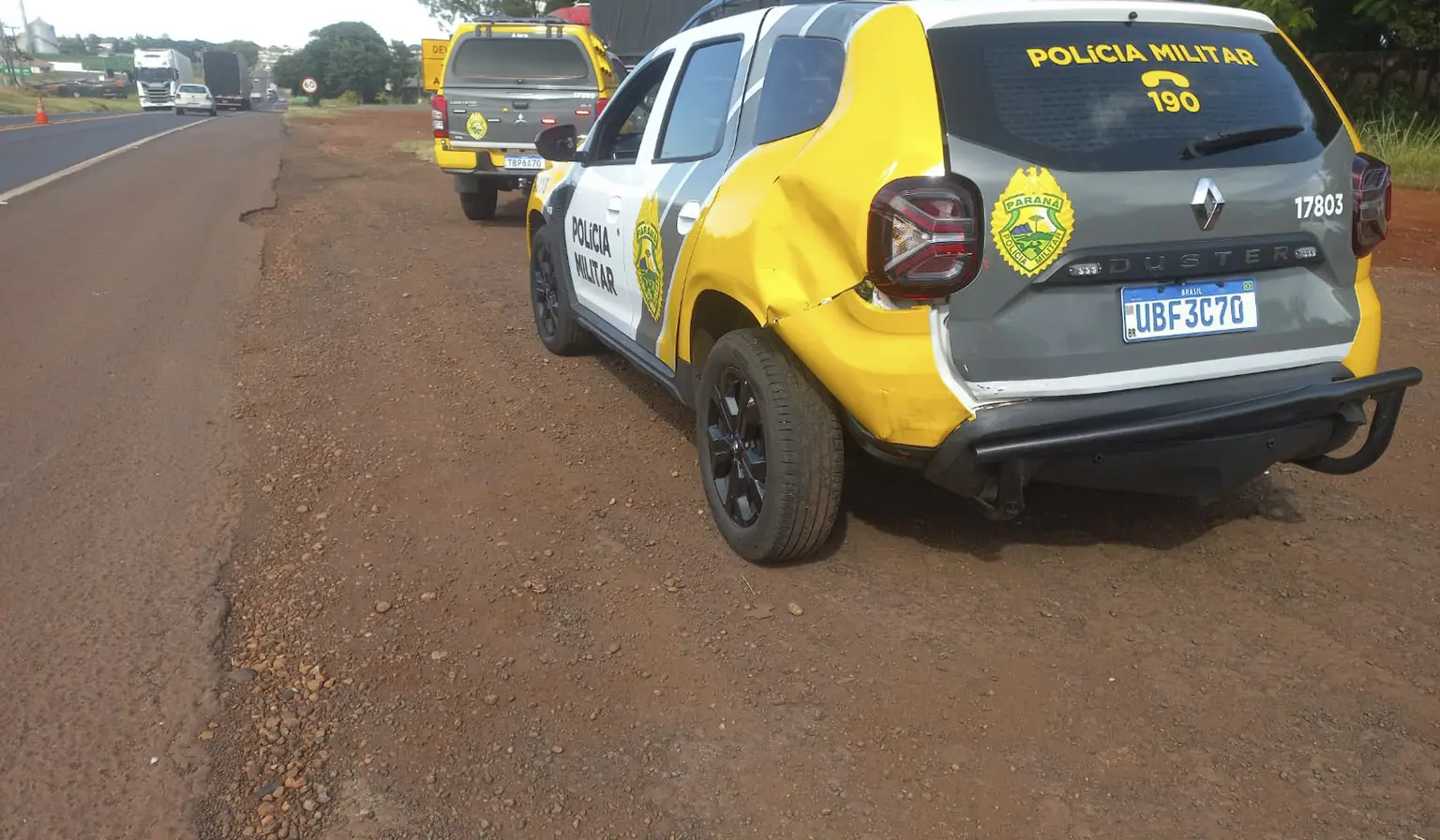 Durante a manobra para acessar o acostamento, a viatura reduziu a velocidade e foi atingida na traseira por um veículo utilitário que seguia no mesmo sentido da rodovia. Com o impacto, um policial militar relatou dores nas costas e nos braços, sendo atendido por equipe de emergência e encaminhado ao hospital do município para avaliação médica. O condutor do outro veículo não sofreu ferimentos.