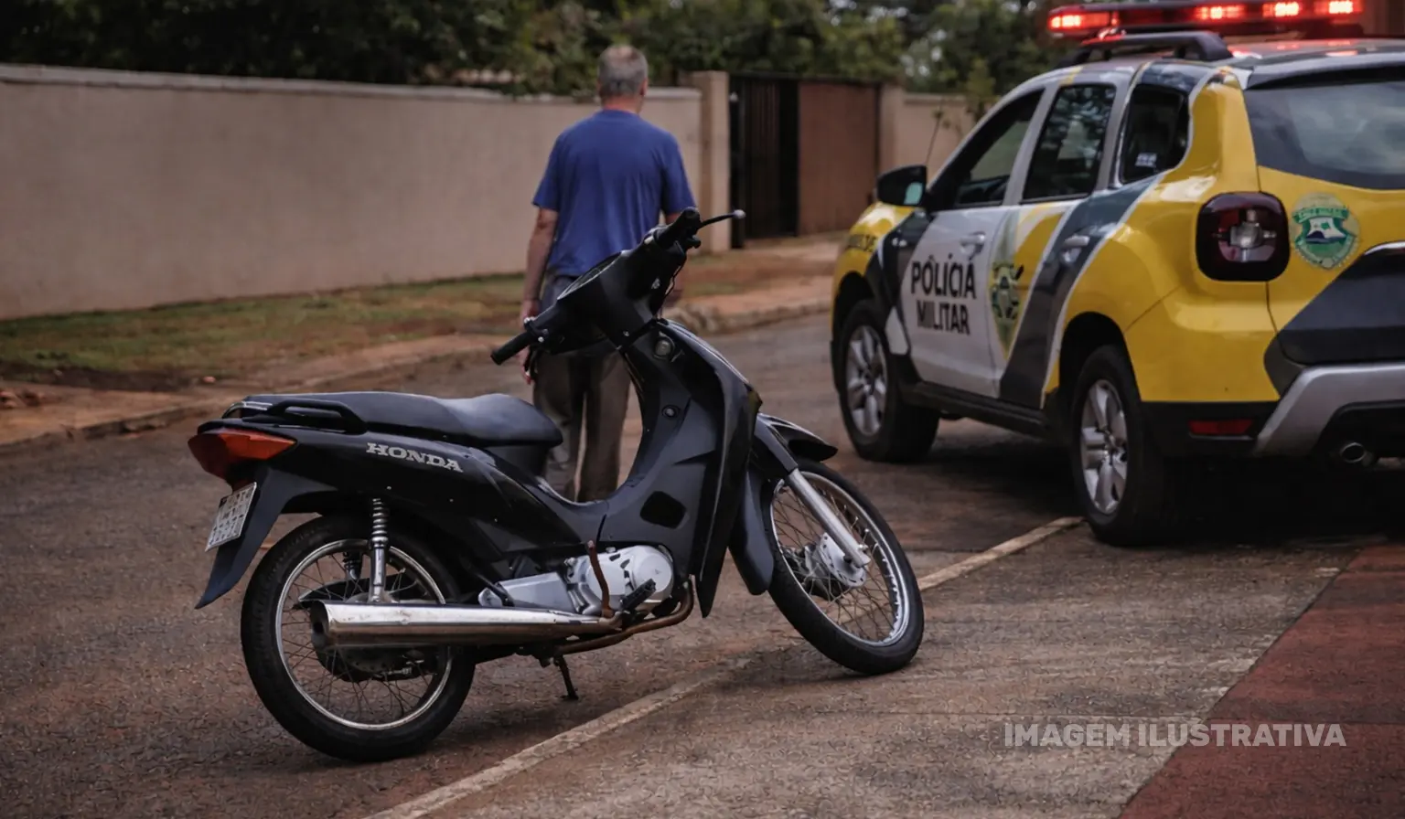Na manhã de segunda-feira, dia 9, por volta das 10h50, a Polícia Militar realizava patrulhamento pela Rua Vicente Machado, em Sertaneja, quando visualizou uma motoneta Honda C100 Biz, de cor preta, estacionada sobre a calçada.