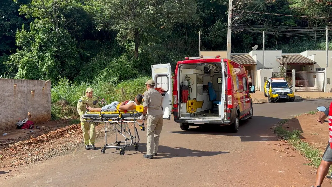 Os socorristas realizaram o curativo no ferimento, que exigiu atenção devido à exposição da área atingida, e fizeram a imobilização da vítima, que foi encaminhada à Santa Casa para avaliação médica. Durante o atendimento, o motociclista também passou a relatar dores nas costas.