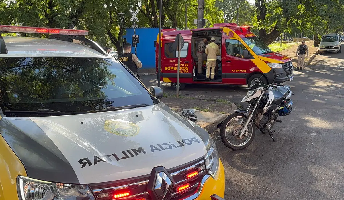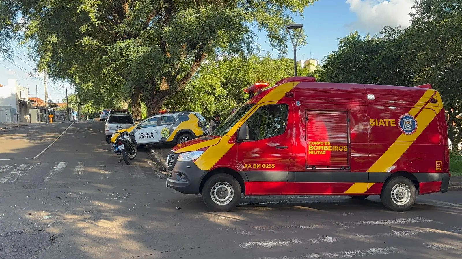 Por volta das 17h07 desta sexta feira, equipes do Corpo de Bombeiros foram acionadas para atender uma colisão entre automóvel e motocicleta no cruzamento da Avenida Paraná com a Rua Rio de Janeiro.