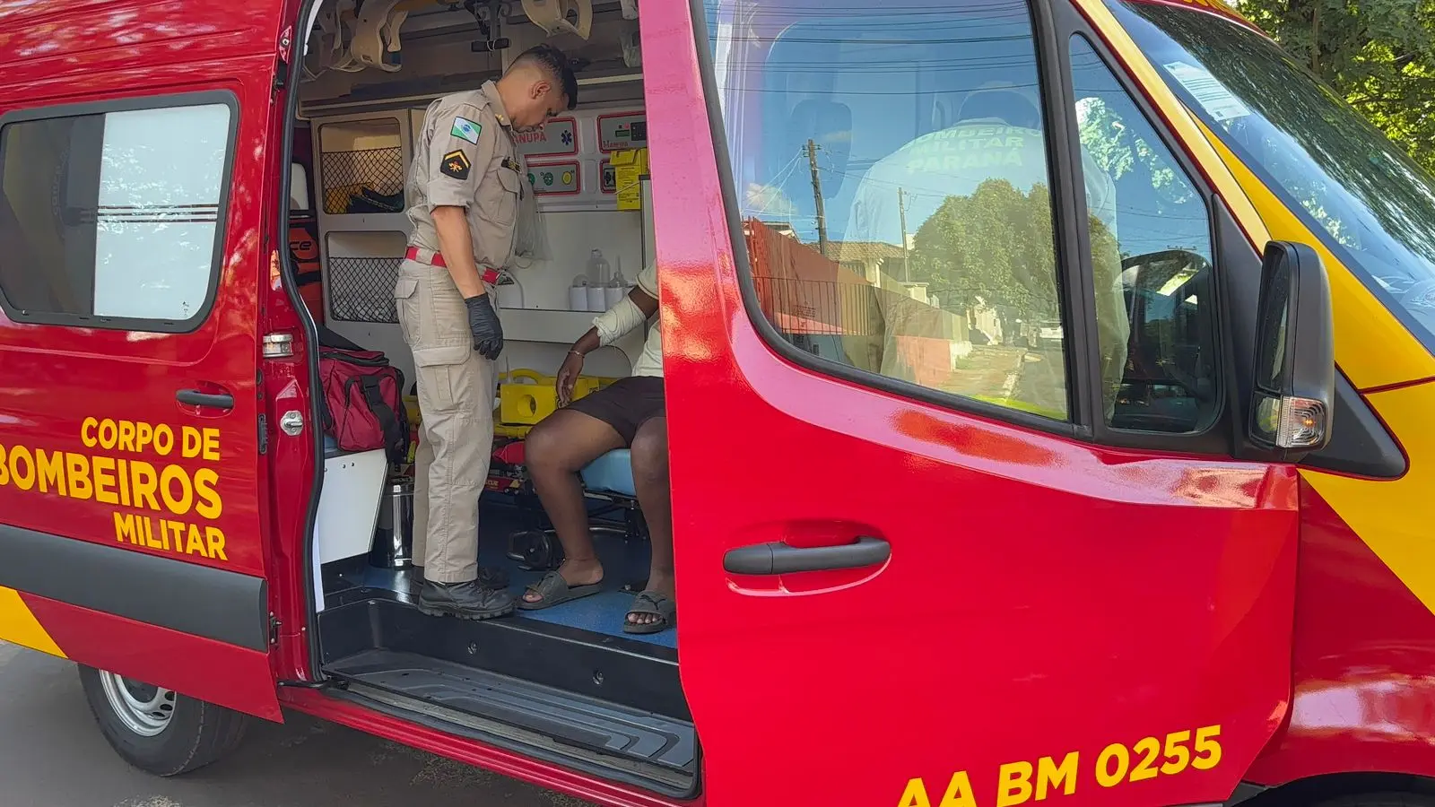 A equipe realizou avaliações no local e não constatou suspeita de fraturas nem outros ferimentos de maior gravidade. O motociclista foi levado para o interior da ambulância para uma avaliação mais detalhada, onde novamente não foram identificadas lesões significativas.