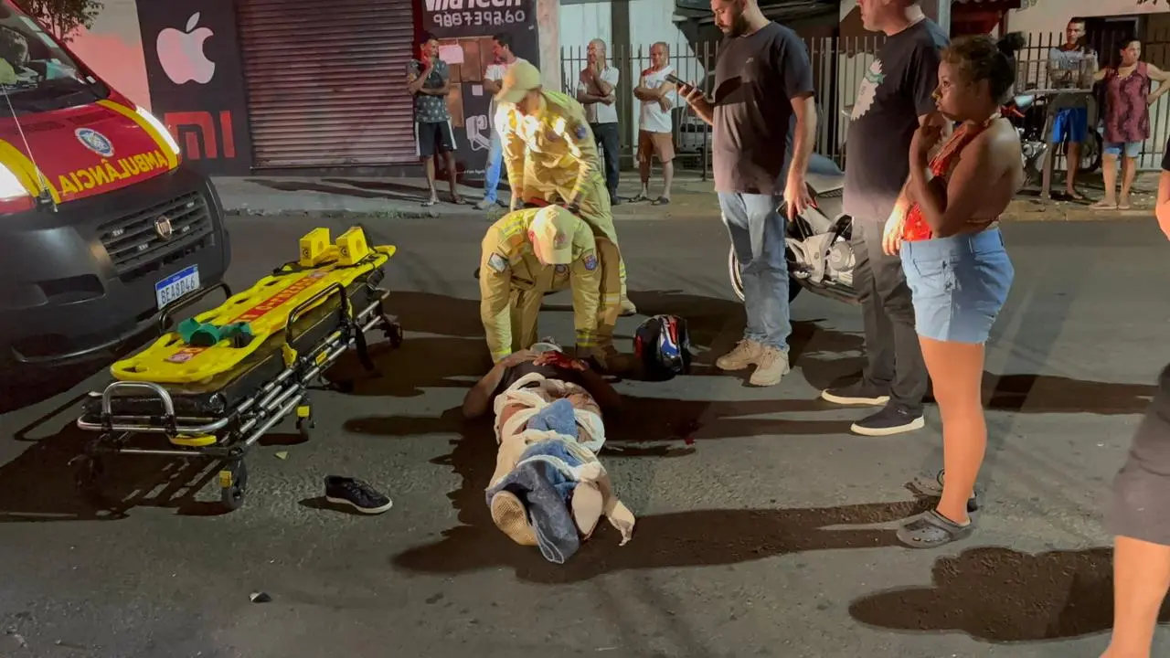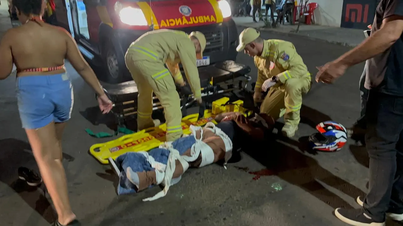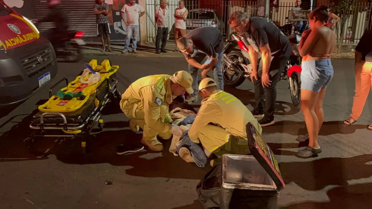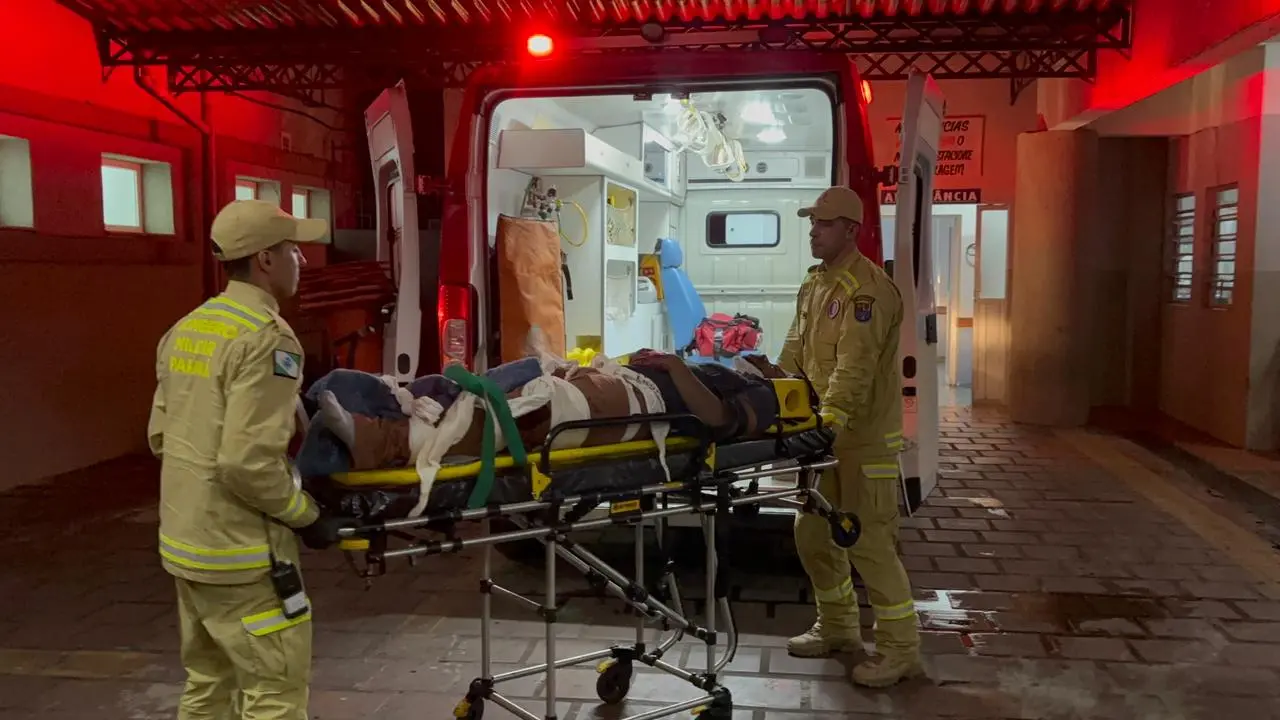 Equipes do Corpo de Bombeiros foram acionadas e, ao chegarem ao local, encontraram a vítima, um jovem entregador, com ferimentos graves. Ele apresentava fratura exposta no fêmur esquerdo, além de suspeita de fratura na mão esquerda e um corte significativo no lábio, com sangramento.
