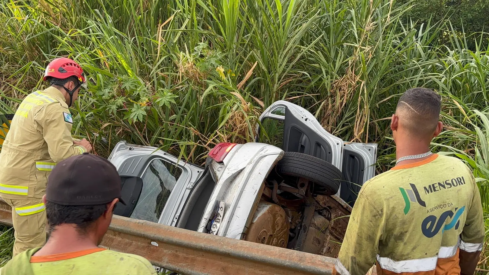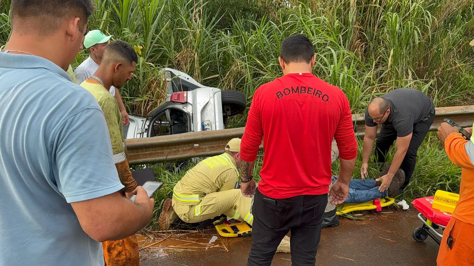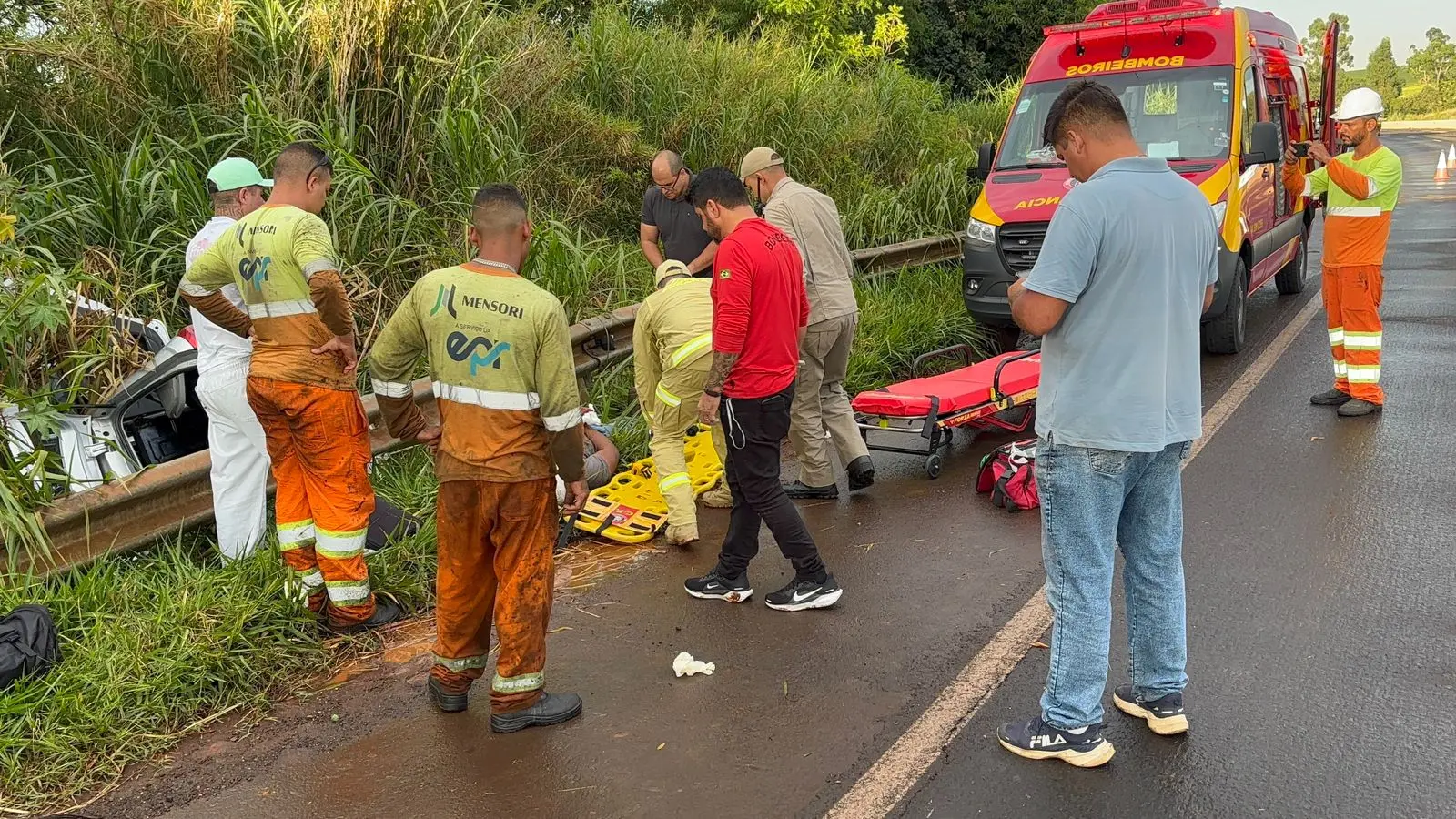 Os socorristas também observaram que a rodovia estava molhada, possivelmente devido à chuva pouco antes do acidente, o que pode ter contribuído para a perda de controle do veículo e a saída de pista.